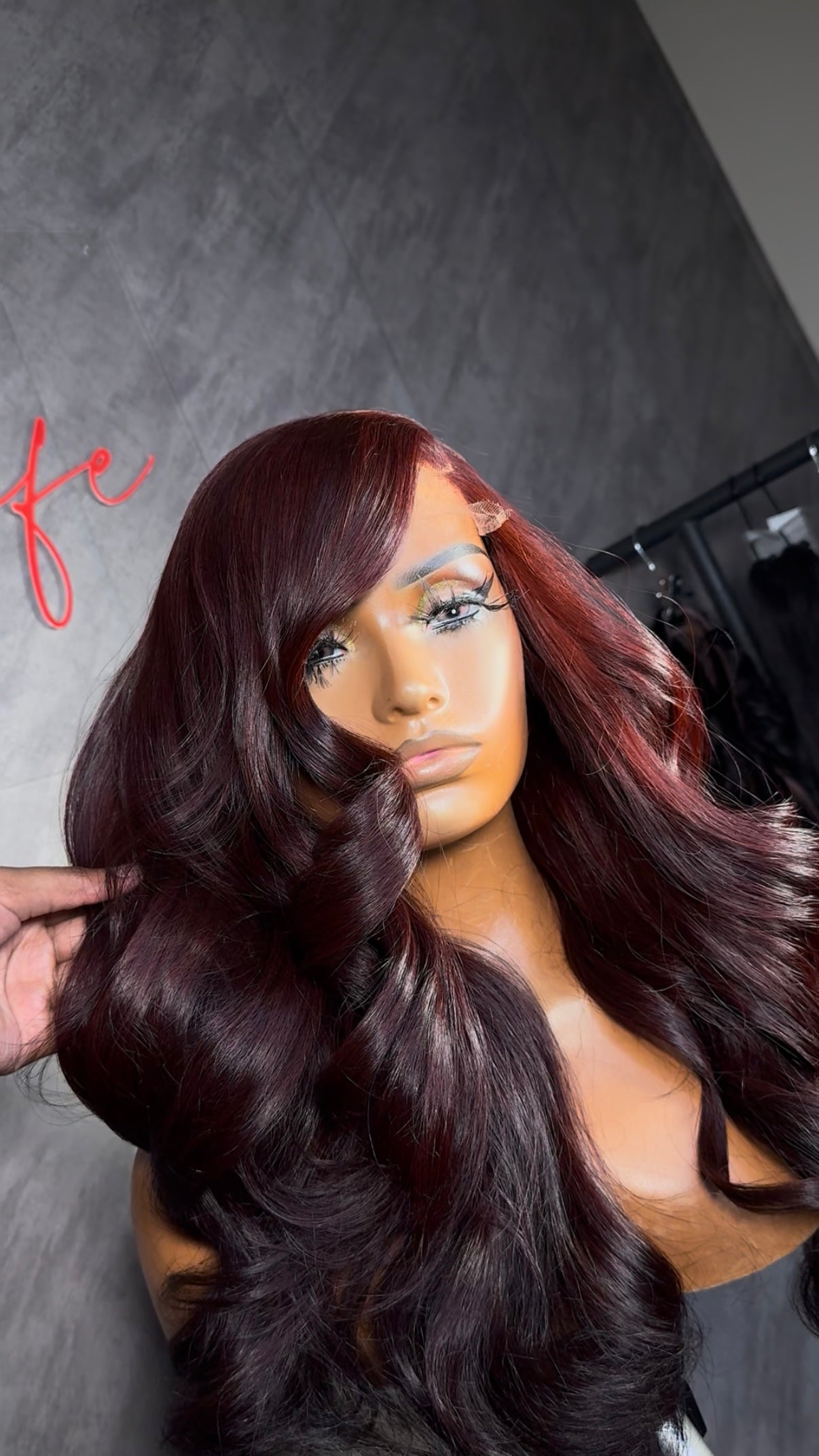 She’s a 20-inch burgundy beauty, deep and sultry in color with that 5x5 HD closure that melts like butter. Glueless, customized, and styled to perfection — she’s literally a “throw on and go” wig that still looks like you planned it weeks in advance.
